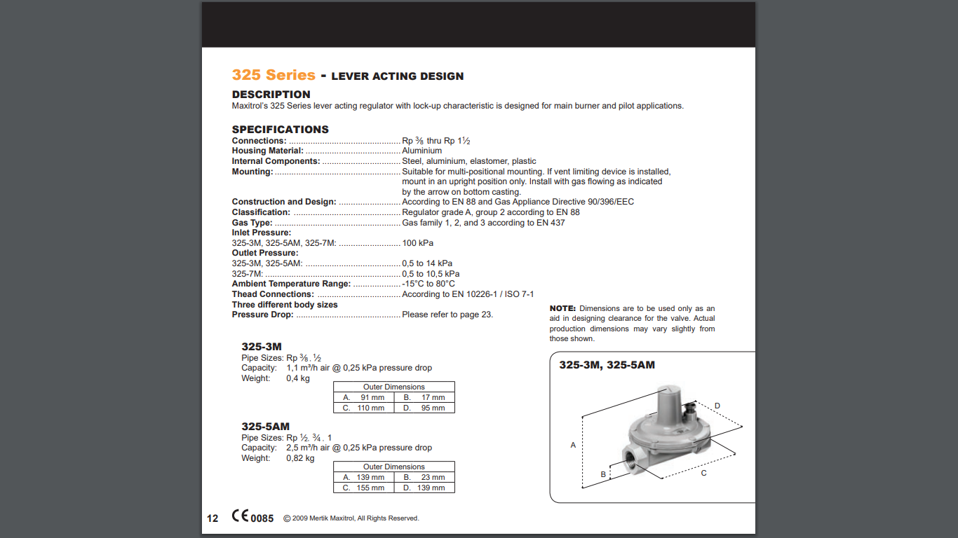 Maxitrol's 325 series lever acting regulator with lock-up characteristics is designed for main burner and pilot applications.